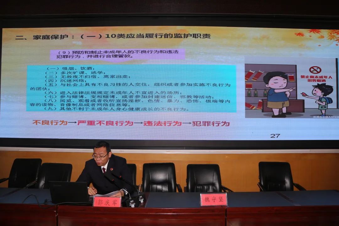 郭庆军检察长首先从家庭保护、学校保护、社会保护、司法保护、网络保护和政府保护等六个层面深入阐述了“未保法”的相关规定,并结合学生身边具体事例和案例,以生动形象的语言,使同学们更加清晰的了解到自己在校内外遇到各类情况时,应该如何正确维护自己的合法权益。