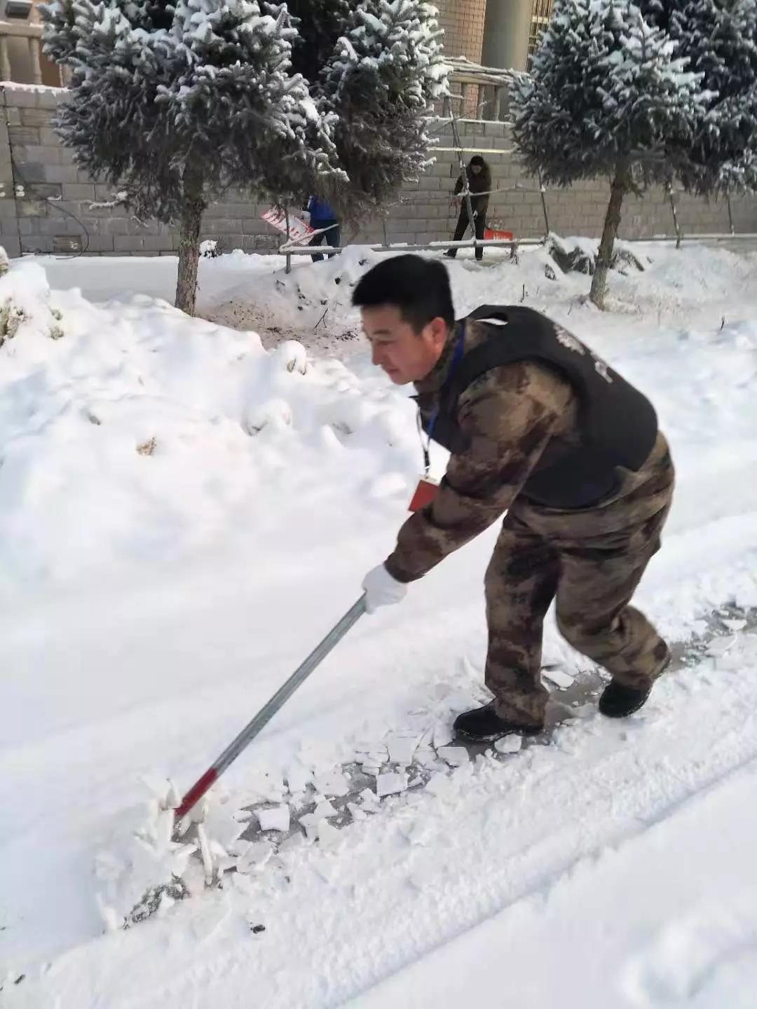 顿时,似乎有一种力量在感召,穿着值班迷彩服和防爆背心,我冲了出去,迅速参与到扫雪中。