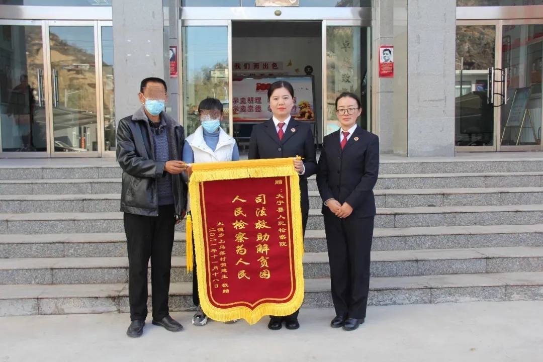 “感谢检察院,感谢司法救助,感谢检察官对我们一家人的关怀。”贺某某激动地说到。近日,案件当事人贺某某及其父亲来到大宁县人民检察院,送来了写有“人民检察为人民,司法救治解贫困”的锦旗,表示真挚感谢。