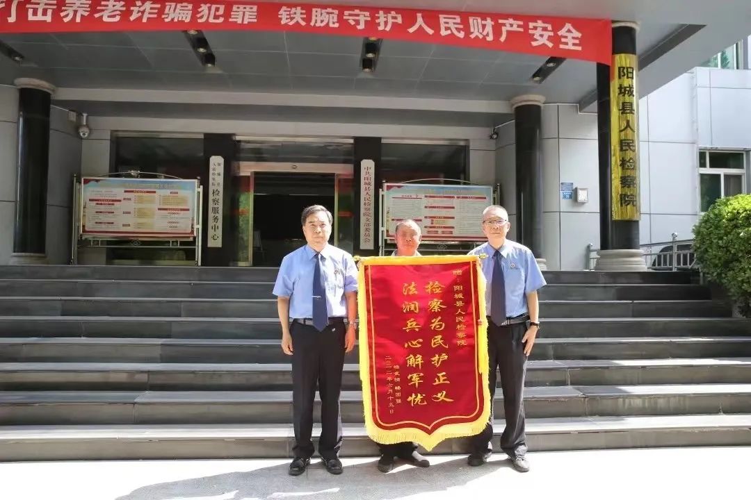 7月6日,军属畅某强将一面绣有“检察为民护正义 法润兵心解军忧”的锦旗送到阳城县检察院,对该院与石家庄军事检察院合力维护军属合法权益表示衷心感谢。