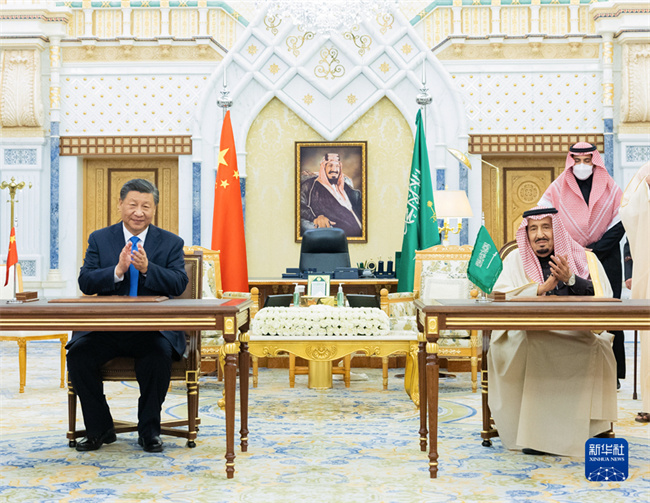当地时间12月8日下午,国家主席习近平在利雅得王宫会见沙特国王萨勒曼。这是两国元首亲自签署《中华人民共和国和沙特阿拉伯王国全面战略伙伴关系协议》,同意每两年在两国轮流举行一次元首会晤。新华社发