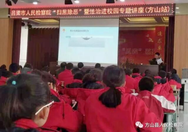 为提升未成年人自觉守法意识和自我保护意识,从源头上预防和减少学生违法犯罪案件发生,确保校园安全和在校学生人生安全。11月16日,由吕梁市人民检察院联合方山县院举办的“扫黑除恶”暨法治宣传进校园活动在方山一中开展。市院和部分县院未检领导和干警、县教育局、团委、县一中主要领导及120余名学生代表参加了活动。