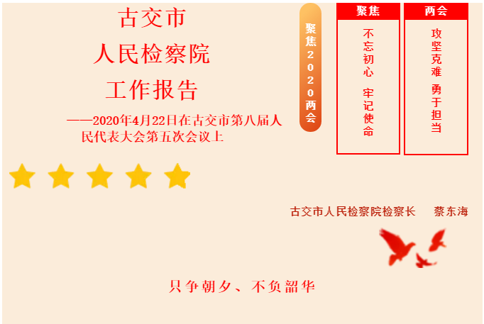 2020年是脱贫攻坚、全面建成小康社会和“十三五”规划收官之年,也是扫黑除恶专项斗争决胜之年。我市检察工作总体要求是:坚持以习近平新时代中国特色社会主义思想为指导,全面贯彻党的十九大、十九届二中、三中、四中全会精神,深入学习习近平总书记“三篇光辉文献”精神,坚决拥护贯彻党的基本理论、基本路线、基本方略,增强“四个意识”,坚定“四个自信”,做到“两个维护”,认真落实上级各项决策部署,积极服务“四为四高两同步”工作部署,坚持讲政治、顾大局、谋发展、重自强,坚持“三个自觉”,聚焦法律监督职责,促改革,强队伍,坚决维护社会和谐稳定,为确保全面建成小康社会目标实现和“十三五”规划圆满收官,努力打造富强古交、绿色古交、宜居古交、平安古交作出新的更大的贡献。
