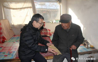 1月4日,元旦刚过,阳光明媚,和风顺畅。忻州市检察院周东曙检察长就来到岢岚县宋家沟乡看望慰问老党员,给他们带来了大米、白面、食用油和慰问金,并送去新春的祝福。