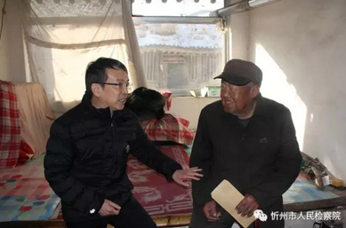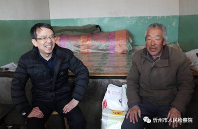 上午十点多,黄道川村老党员高文云老汉就柱着拐杖,早早地站在大门口。墙角的残雪还没有来得及融化,院子已经被打扫的干干净净。一走进门,周检察长就快步走上前,紧紧地握着老高的手:“老先生,你好,我是忻州市检察院的周东曙,今天来看你老人家!”“好,好,感谢你们呀,给我们办了这么多好事情。”坐在炕头,检察长和老汉拉起了家常,并嘱托他保重身体,有什么困难及时给第一书记沟通,高文云指着陪同的市检察院驻村第一书记王晋龙说:“知道,小伙子经常来我家,他们工作辛苦了。”